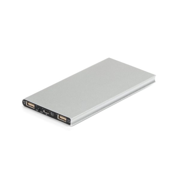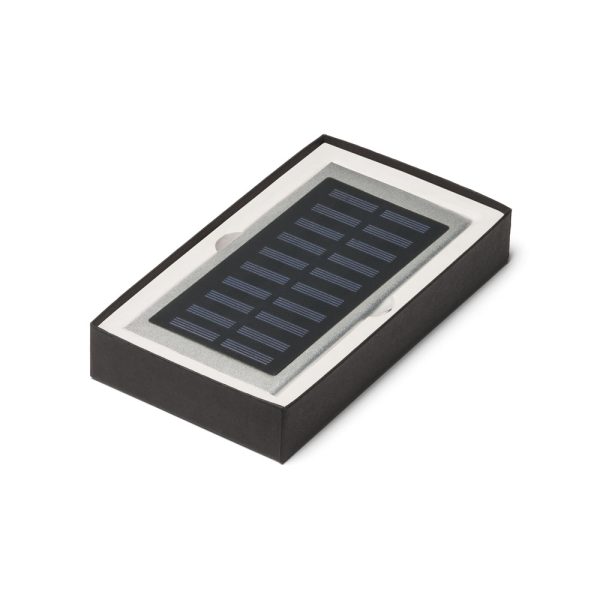 CERES. Bateria portátil em alumínio com painel solar e LED. Bateria de lítio com capacidade de 8.000 mAh e tempo de vida ≥ 500 ciclos. Com entrada 5V/1A, saída 5V/1-2.1A e 2 portas USB. Incluso cabo USB / micro USB para carregar a bateria. Fornecida em caixa presente. 155 x 75 x 10 mm | Caixa: 175 x 100 x 30 mm