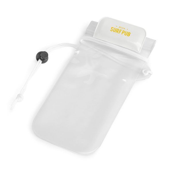 Bolsa para celular em PVC impermeável (não aconselhável imersão). A parte frontal é transparente e a parte dianteira é em branco fosco. Permite interagir com o tela a partir do exterior. A bolsa tem fechamento hermético e aba em cor com fechamento em velcro. 240 x 95 mm