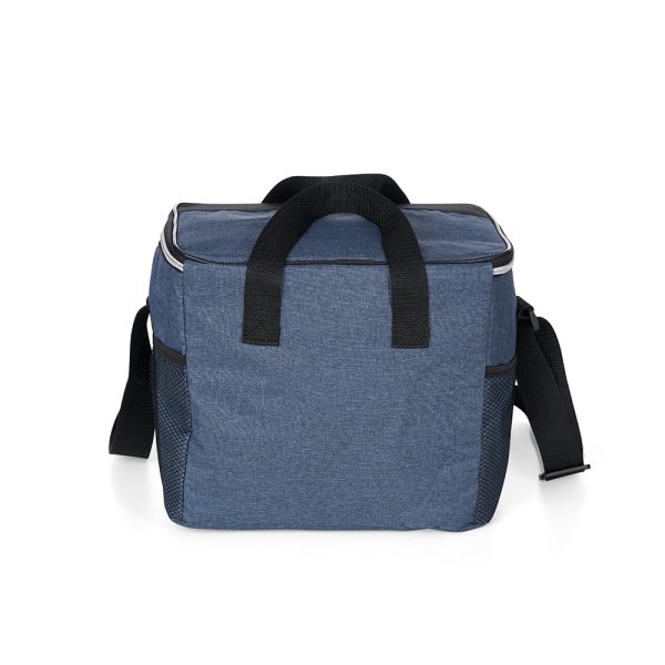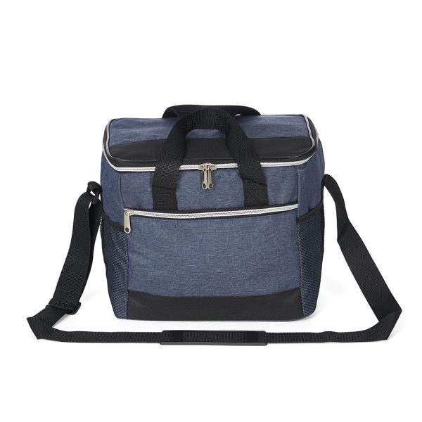 Bolsa térmica 18 litros. Contém bolso frontal com zíper, bolsos laterais telados, alça de mão em nylon e alça transversal regulável (não removível) com apoio para ombro.