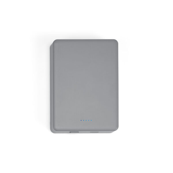 Bateria portátil de carregamento rápido em ABS 100% reciclado com acabamento em mate. A bateria leve em lítio e com design slim, tem uma capacidade de 10.000 mAh e tempo de vida ≥ 300 ciclos. Esta bateria portátil torna-se muito prática para o dia a dia uma vez que permite, através do seu magnetismo, prender atrás dos smartphones ou capas com este sistema. Possui entrada/saída USB-C e potência máxima de 15W para carregamento rápido sem fios. Compatível com smartphones com tecnologia de carregamento sem fios. Incluso cabo USB-C para carregamento rápido. Fornecido em caixa presente de papel kraft. 90 x 65 x 19 mm | Caixa: 76 x 91 x 23 mm
