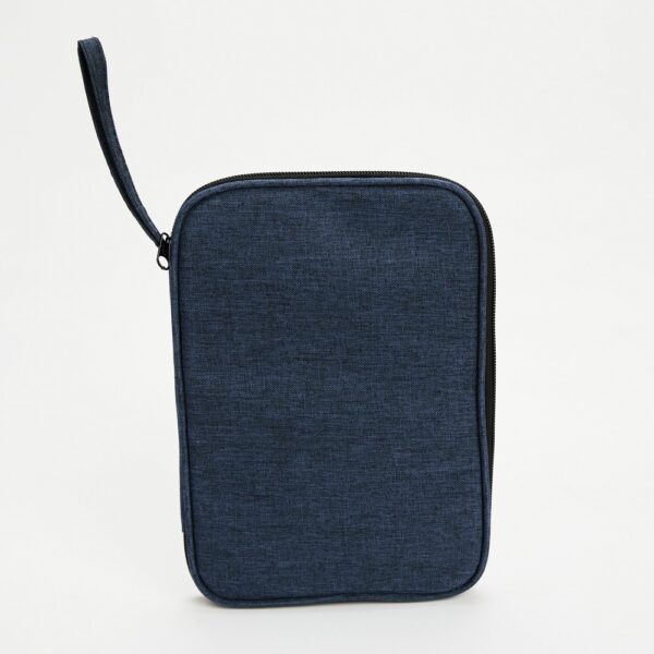 Estojo confeccionado em poliéster resistente à água. Conta com bolso interno em tela de nylon e fechamento em zíper e divisórias em diferentes tamanhos em elástico. Possui alça de mão para transporte.