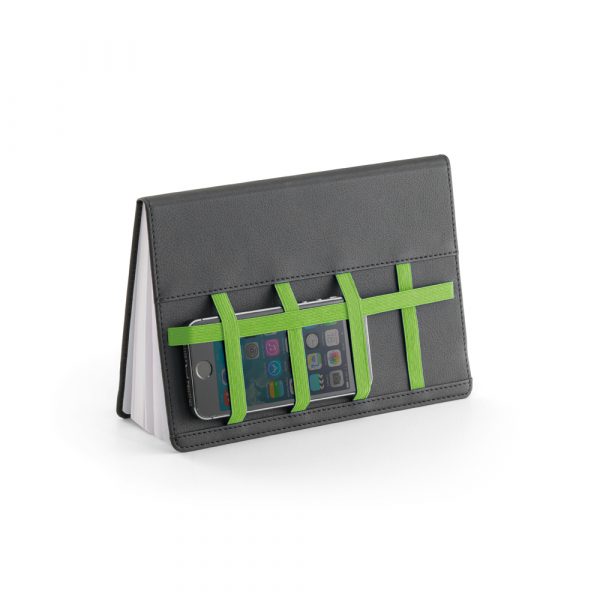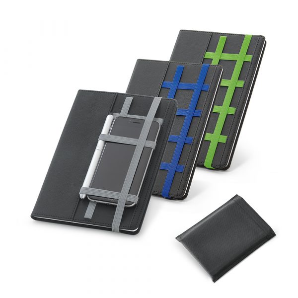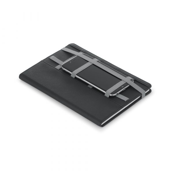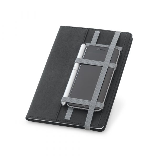 Caderno A5 em c. sintético, capa dura e 80 folhas lisas. Contém elásticos com capacidade para suportar esferográfica (não inclusa), celular e cartões e um elástico para fechar o bloco de notas. Fornecido em bolsa de non-woven. 150 x 210 mm | Bolsa: 185 x 240 mm