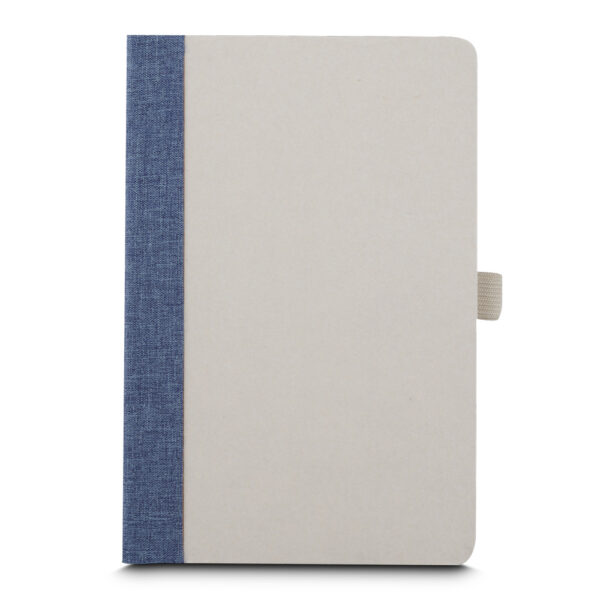 Caderno de anotações, capa em fibra de açucar e tecido RPET com suporte para caneta, miolo com 80 folhas pautadas na cor bege.