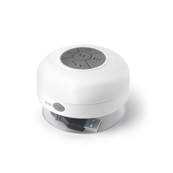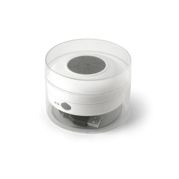Caixa de som à prova de água em ABS e acabamento emborrachado com ventosa. transmissão sem fios BT v5.0 e potência de 3W/4Ω. Autonomia aproximada de 3 h. Função para atender chamadas, controle de volume e conexão à playlist do dispositivo móvel. Incluso cabo para carregamento. Fornecida em caixa presente. ø85 x 50 mm | Caixa: 88 x 88 x 55 mm