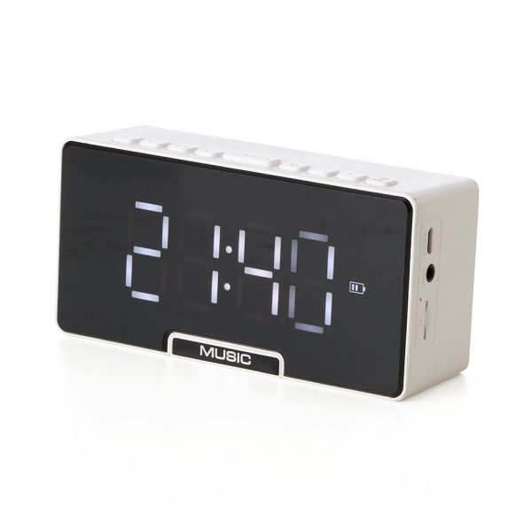 Caixa de som multimídia com relógio despertador e suporte para celular. Produzida em plástico e com borrachas antiderrapantes na área inferior, a caixa de som tem a área frontal com display de LED, além de um compartimento com suporte para celular – uma espécie de “gaveta” aonde é exibido (MUSIC), basta puxá-la ter acesso ao compartimento. A caixa de som executa nos modos bluetooth, cartão TF-microSD e entrada auxiliar P2. Acompanha cabo USB e manual em inglês.