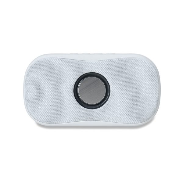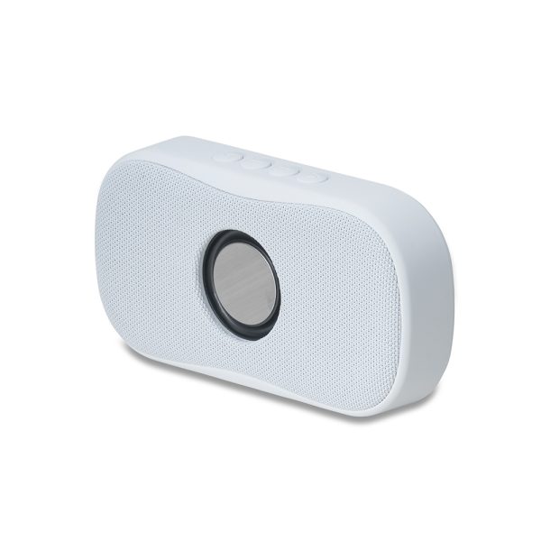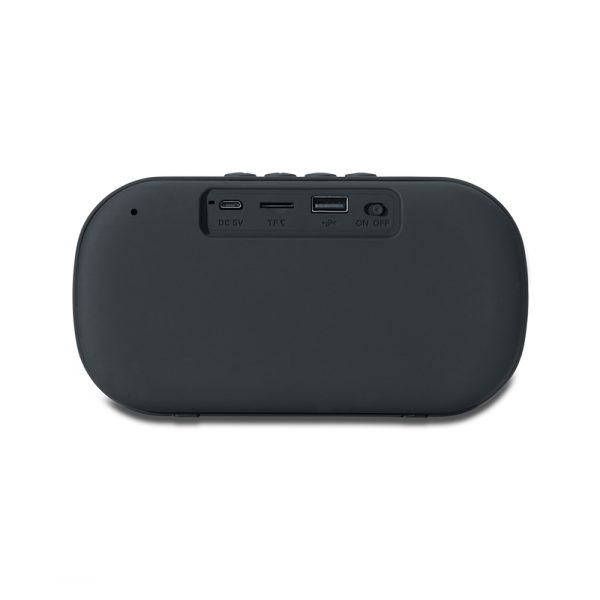 Caixa de som plástica multimídia com efeito visual, são geradas vibrações no alto-falante ao reproduzir músicas com batidas graves. Operante nos modos: bluetooth, rádio FM, cartão microSD e atendimento de chamadas. Contém plaquinha metálica fixa na área frontal e base com borrachas antiderrapantes. Acompanha cabo USB.