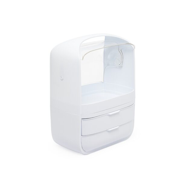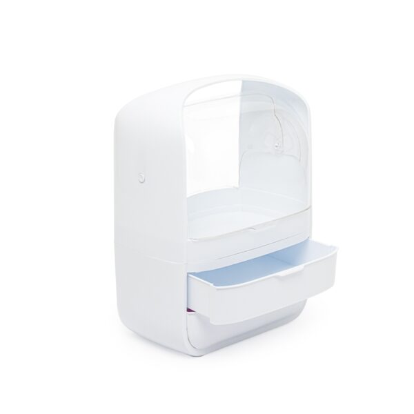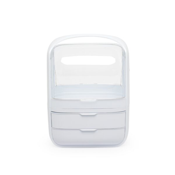 A caixa organizadora para maquiagens e cosméticos é prática e eficiente. Feita em plástico resistente com tampas de acrílico, ela protege os itens contra poeira e umidade, garantindo que tudo fique sempre seguro e preservado. Com um compartimento principal espaçoso e duas gavetas extras, é possível armazenar tudo de forma organizada. Além disso, a alça de transporte facilita levar a caixa para qualquer lugar, transformando qualquer ambiente no espaço perfeito para a rotina de beleza.