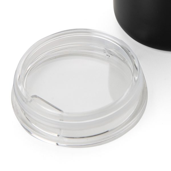 Caneca 350 ml parede dupla em Inox, com pegador de inox, contém tampa transparente com compartimento para beber.