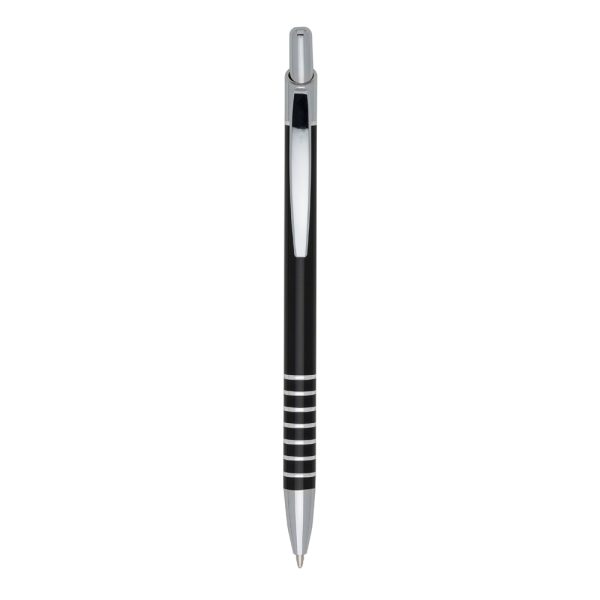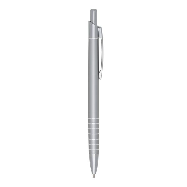 Caneta metálica com carga esferográfica azul e acionamento por clique.