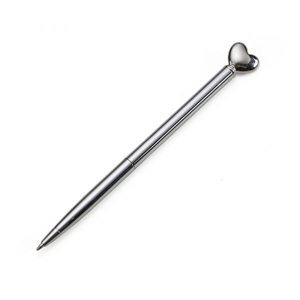 Caneta metálica coração, acionamento por rotação e carga esferográfica na cor azul.