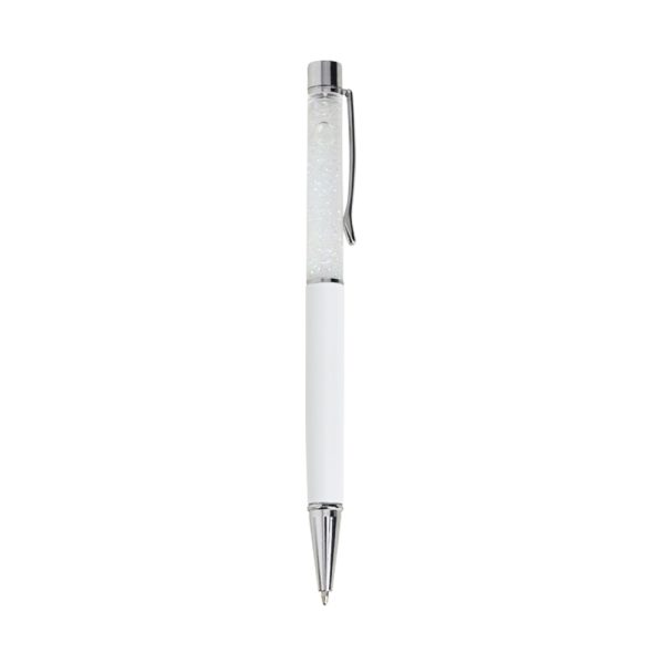 Caneta metálica com glitter, acionamento por rotação e carga esferográfica 1.0mm azul.