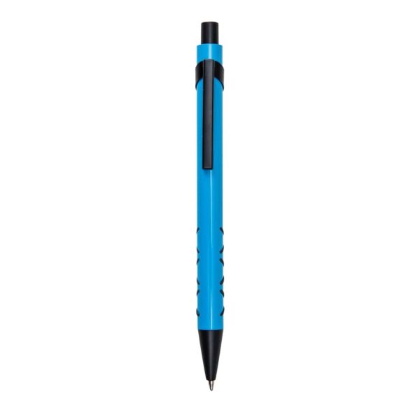 Caneta metálica com detalhe emborrachado, carga esferográfica azul e acionamento por clique. OBS.: PEDIDO APENAS MÚLTIPLO DE 50 PEÇAS!