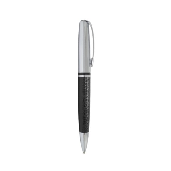 Caneta metálica com detalhe em couro sintético, carga esferográfica azul e acionamento por rotação.