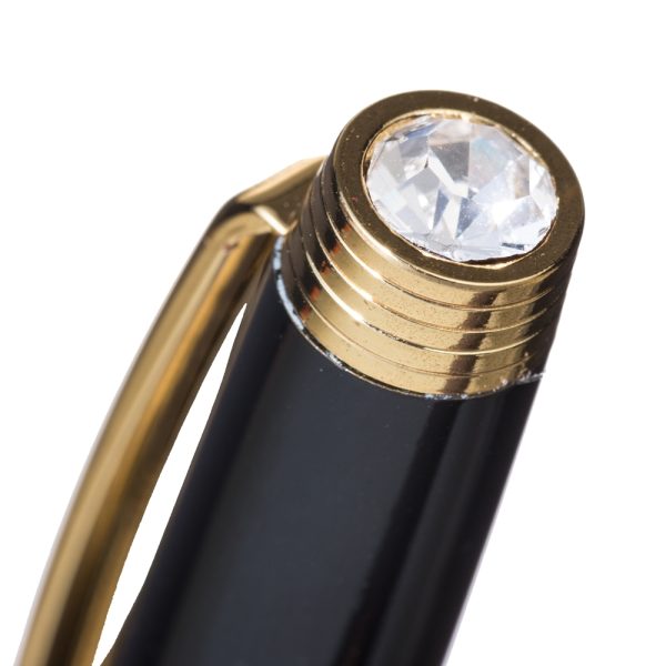 Caneta metal preta com detalhes dourados. Clip metal com quatro anéis em relevo no suporte dourado e na ponta superior possui um cristal. Anel central e ponteira dourada, aciona por giro. OBS.: PEDIDO APENAS MÚLTIPLO DE 50 PEÇAS!