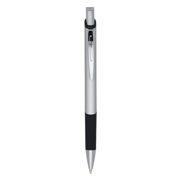 Descrição: Caneta metálica com design quadrangular, acabamento brilhante (exceto a prata) e detalhe emborrachado, carga esferográfica azul e acionamento por clique.