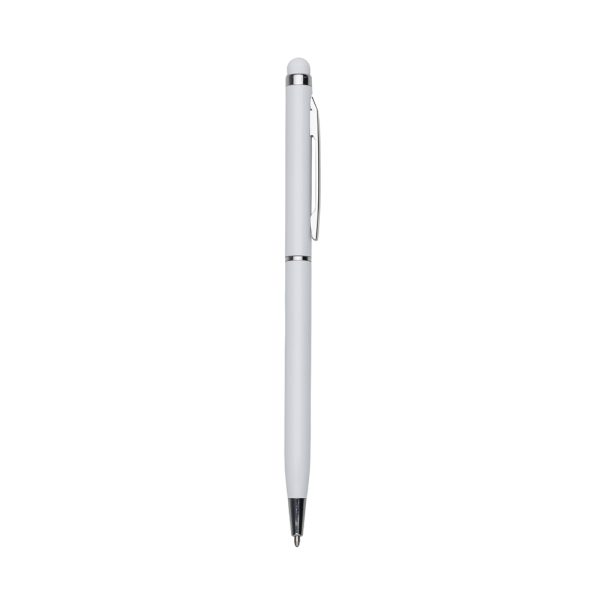 Caneta metálica com touch screen, carga esferográfica azul e acionamento por rotação.