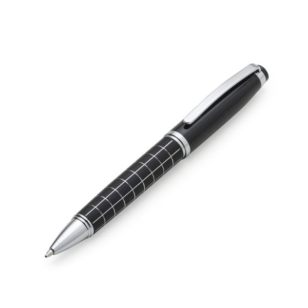 Caneta metal inteira colorida com detalhes prata e quadriculados. Clip metal com anel superior e anel central prata, possui dois anéis em relevo na ponteira. Aciona por giro. OBS.: PEDIDO APENAS MÚLTIPLO DE 15 PEÇAS!