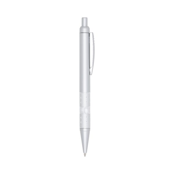 Caneta plástica com detalhe strass, carga esferográfica azul e acionamento por clique.