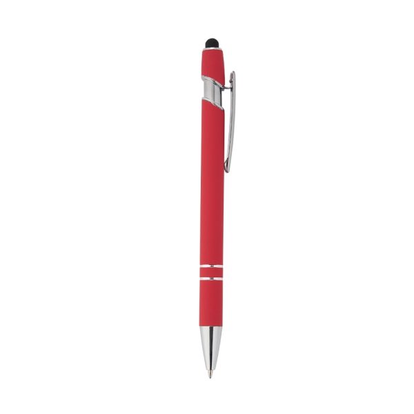 Caneta metálica touchscreen com acabamento similar à borracha, acionamento por clique e carga esferográfica azul 1.0mm.