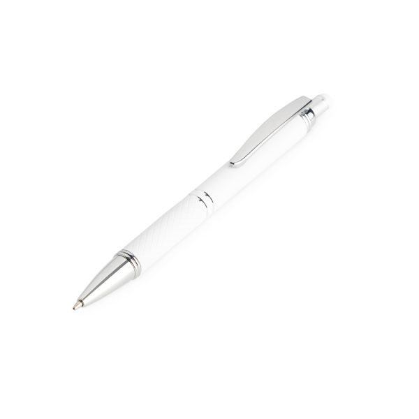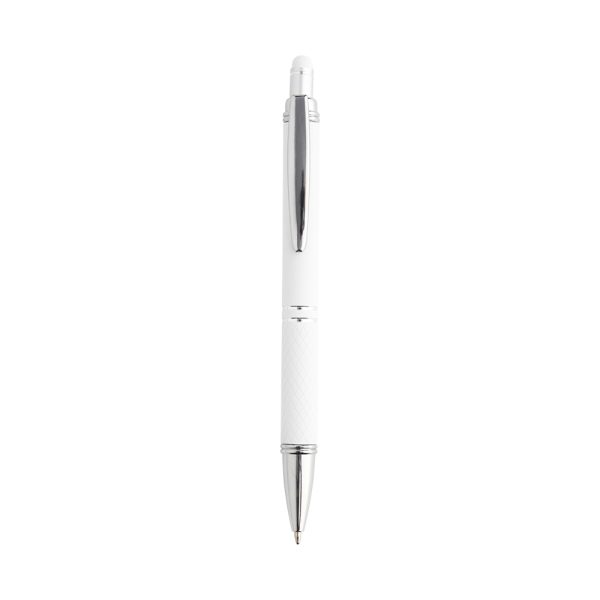 Caneta metálica touchscreen com acabamento similar à borracha e parte inferior texturizada, acionamento por clique e carga esferográfica azul 1.0mm.
