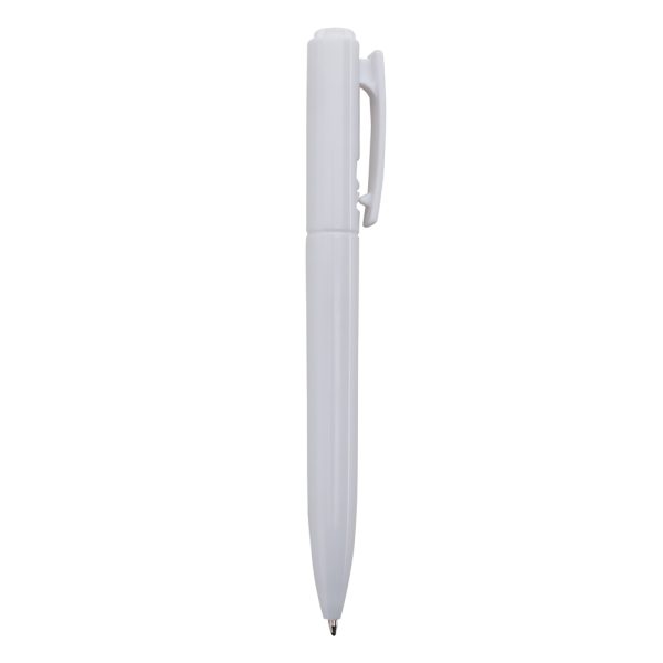 Caneta plástica com carga esferográfica azul e acionamento por clique.