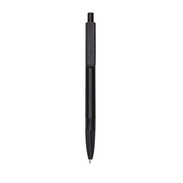 Caneta plástica com carga esferográfica azul e acionamento por clique.
