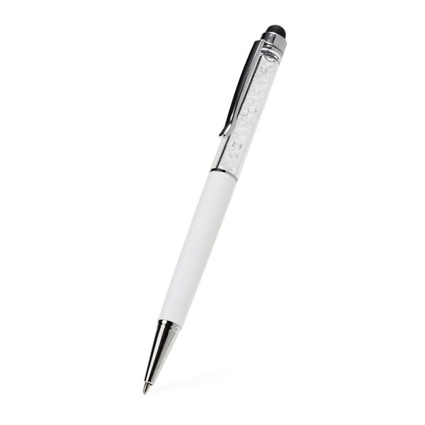 Caneta plástica com touch screen e detalhes em cristal, acionamento por rotação e carga esferográfica azul 1mm.