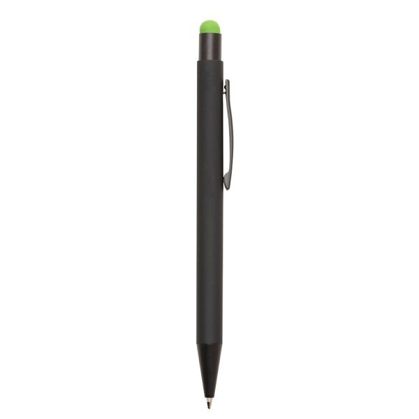 Caneta metálica com touch screen, carga esferográfica azul e acionamento por clique.