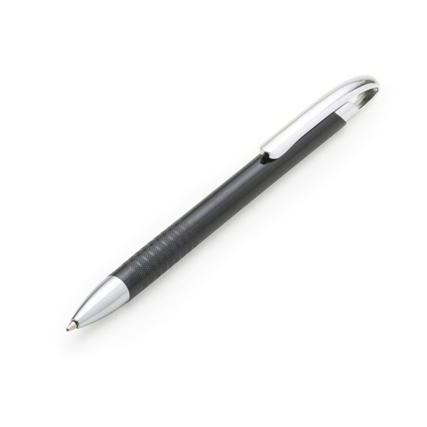 Caneta semimetálica, carga esferográfica azul e acionamento por clique.