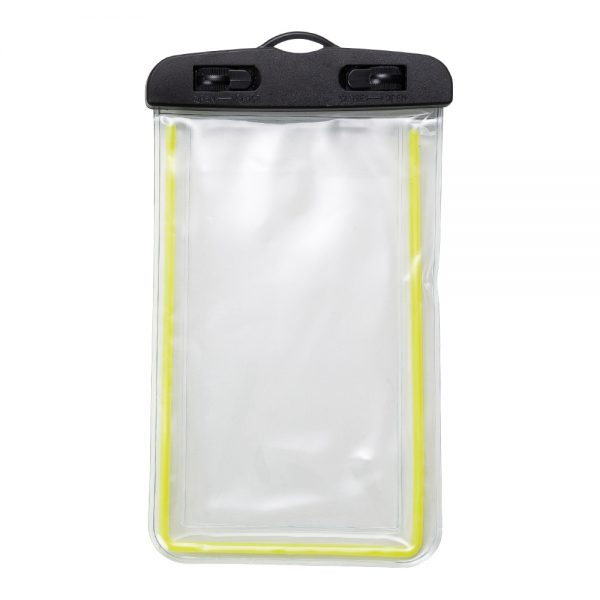 Capa impermeável transparente para celular. Possui contorno colorido na capa, suporte plástico superior com fivelas rotatórias(basta rotacioná-las para abrir o case). Acompanha cordão de cetim.