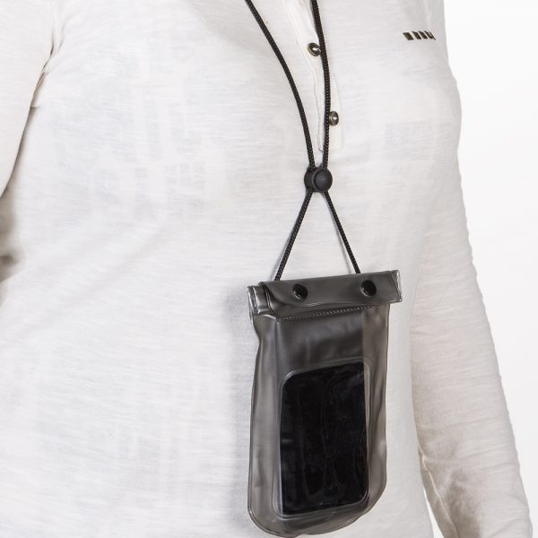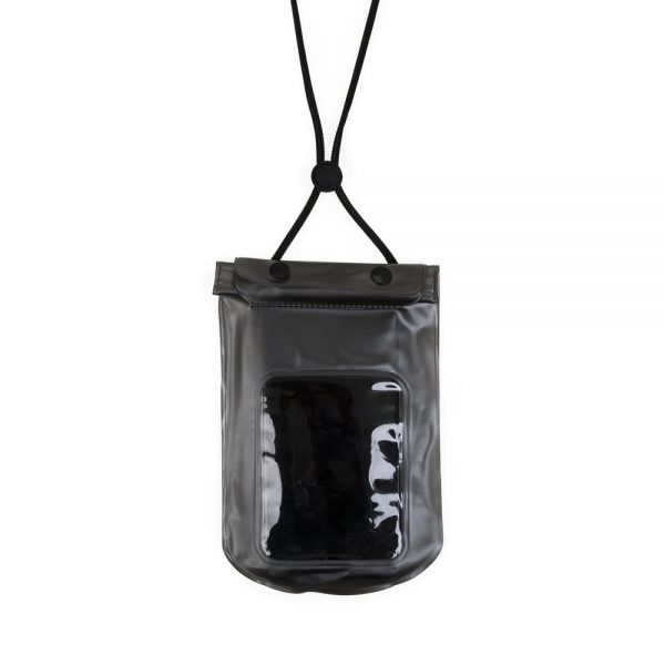 Case impermeável para smartphone, fechamento á vácuo e através de abotoamento, com cordão de nylon, fabricado em PVC.