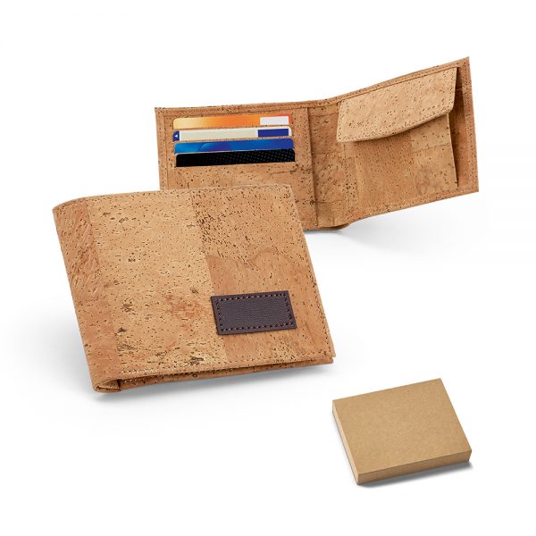 Carteira. Cortiça. Com porta níquel e capacidade para 4 cartões.