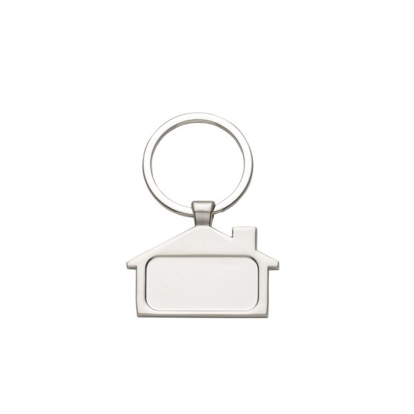 Chaveiro metal fosco formato casa. Parte frontal com desenho em relevo das janelas e portas, verso com um retângulo no centro ideal para personalização.
