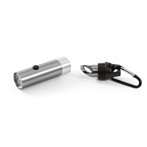 Lanterna em alumínio com 6 LEDs, abridor de garrafas e mosquetão. Incluso 2 pilhas CR2032. ø25 x 102 mm