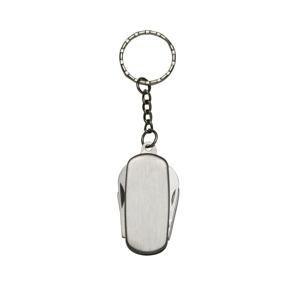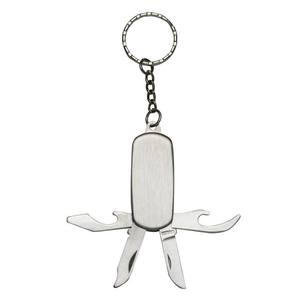 Descrição: Chaveiro canivete 4 funções de metal liso(ambos lados). Possui: abridor de lata, lixa, lâmina de corte e abridor de garrafa.