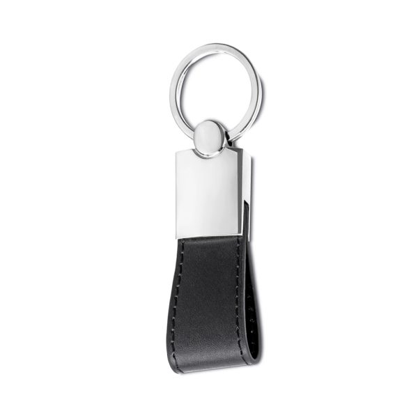 Chaveiro metal brilhante com alça em couro sintético, frente lisa e verso com dois parafusos.