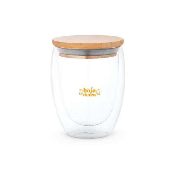 ECUADOR 350. Copo de viagem em vidro borossilicato com parede dupla isolada a ar e tampa em bambu (térmico). Copo com capacidade até 350 mL, ideal para líquidos frios ou quentes, tendo uma tampa com isolante em silicone que facilita o transporte do copo evitando respingo. Apto para ir ao microondas e à máquina de lavar, retirando a tampa. Certificação EU Food Grade. Fornecido em caixa presente de papel kraft. ø91 x 119 mm