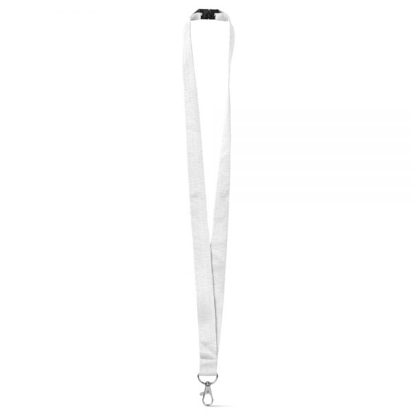 Cordão de pescoço com fecho de segurança e mosquetão.