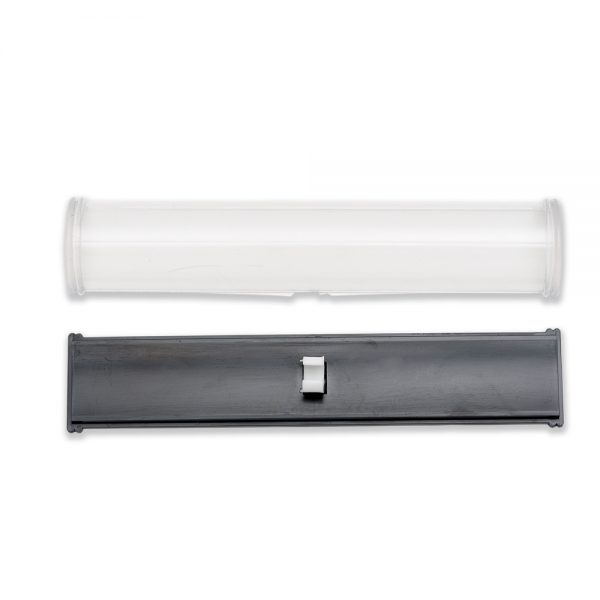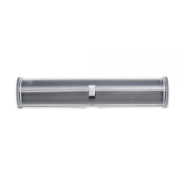 Estojo de acrílico para uma caneta formato meia lua. Verso plástico preto com suporte branco interno para fixar caneta.