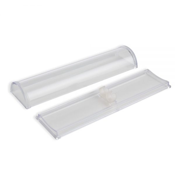 Estojo de acrílico meia lua para duas canetas, possui suportes plásticos na área interna para fixar as canetas.