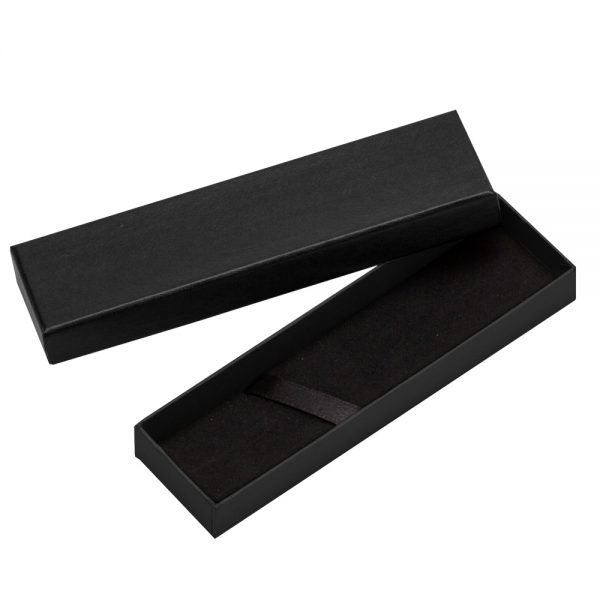 Estojo de papelão para uma caneta com, tampa preta. Parte interna revestida com veludo e possui fita de cetim para fixar a caneta.
