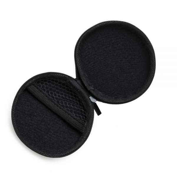 Estojo redondo de material emborrachado fosco. Parte interna com rede de nylon, ideial para montar um kit tecnológico.