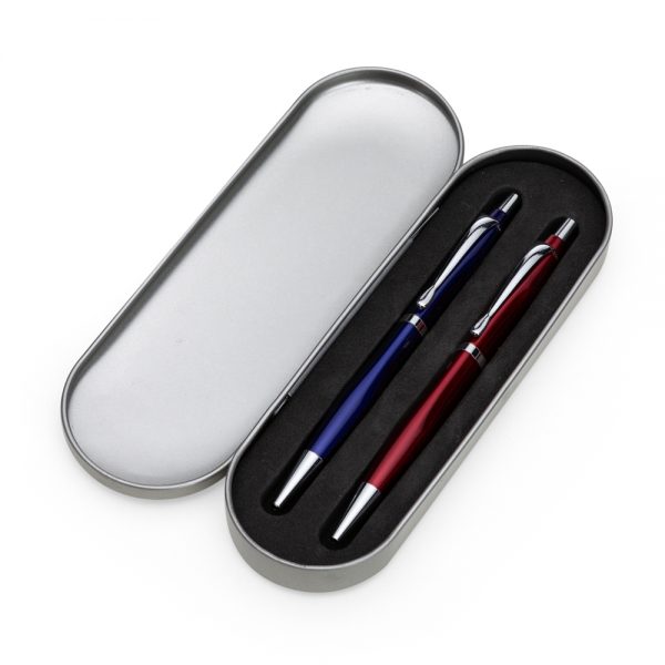 Estojo de metal brilhante para uma caneta com parte interna revestida de espuma. Imagem meramente ilustrativa, NÃO ACOMPANHA CANETA!