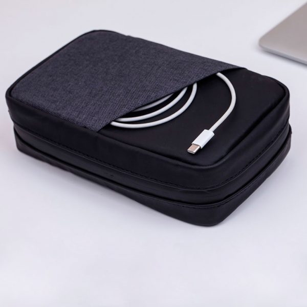 Estojo para kit tecnológico com bolso externo. Produzido em poliéster com detalhes emborrachado, parte interior com duas divisórias e um bolso com zíper. Possui fita elástica com divisão para encaixe de itens.