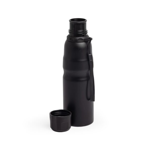 Garrafa inox 800ml com tampa plástica rosqueável e cordão para transporte.