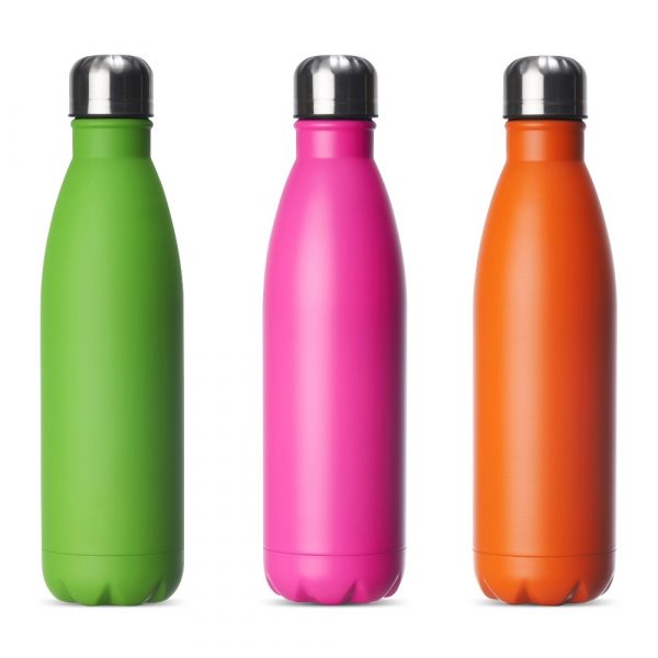 Garrafa 750ml em inox com tampa rosqueável e pintura fosca metalizada. Obs.: Não é um modelo térmico.