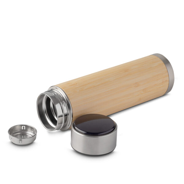 Com revestimento externo em fibra de bambu e infusor para chás. Conserva líquido quente por até 12 horas e líquido frio até 18 horas.