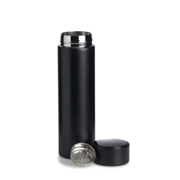 Garrafa térmica de parede dupla em inox, capacidade de 400ml. Tampa com display touch screen de temperatura em led, acompanha infusor de bebidas.