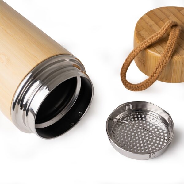 Garrafa térmica de bambu e inox 400 ml e infusor de metal. Contém tampa rosqueável de bambu e alça de tecido embutida.
