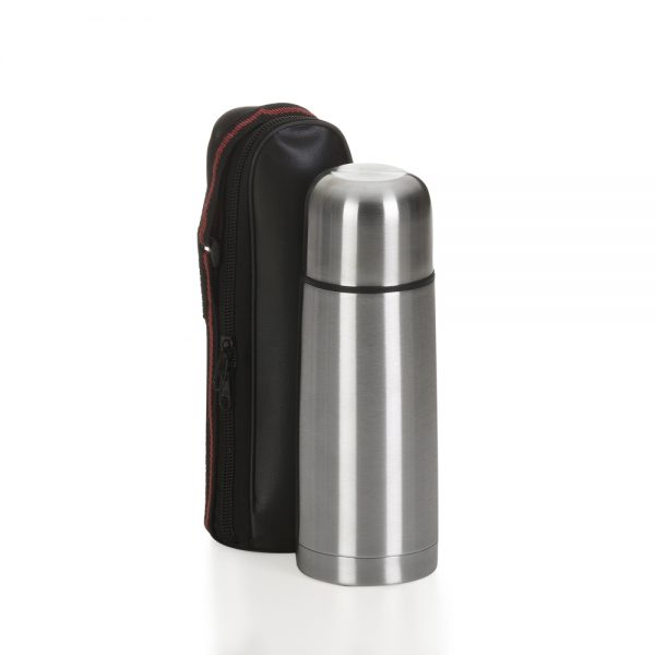 Garrafa térmica 350ml em inox com tampa rosqueável, tampa interna em plástico resistente(basta um clique para abrir ou fechar). Acompanha capa protetora de couro sintético com alça de nylon.